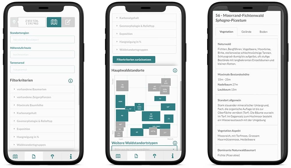 Neben der Waldregion und den Höhenstufen ist der Standortstyp für die Empfehlung von Baumarten notwendig. Die Filterfunktion mit spezifischen Filterkriterien ermöglicht es die Anzahl der möglichen Standorttypen schrittweise immer weiter einzuschränken, bis nur noch der oder die möglichen Standorttypen übrig bleiben. Im Ökogramm der Hauptwaldstandorte werden die zutreffenden Filterergebnisse in Farbe dargestellt. Standorttypen, die nicht den Filterkriterien entsprechen, werden ausgegraut. Die integrierten Standortbeschreibungen geben einen detaillierten Überblick für weitere Informationen zu einem Standorttyp. Die Beschreibungen werden automatisiert aus den Grunddaten generiert. Dies bietet ein einheitliches Layout, Offline-Funktionalität und den geringsten Wartungsaufwand.